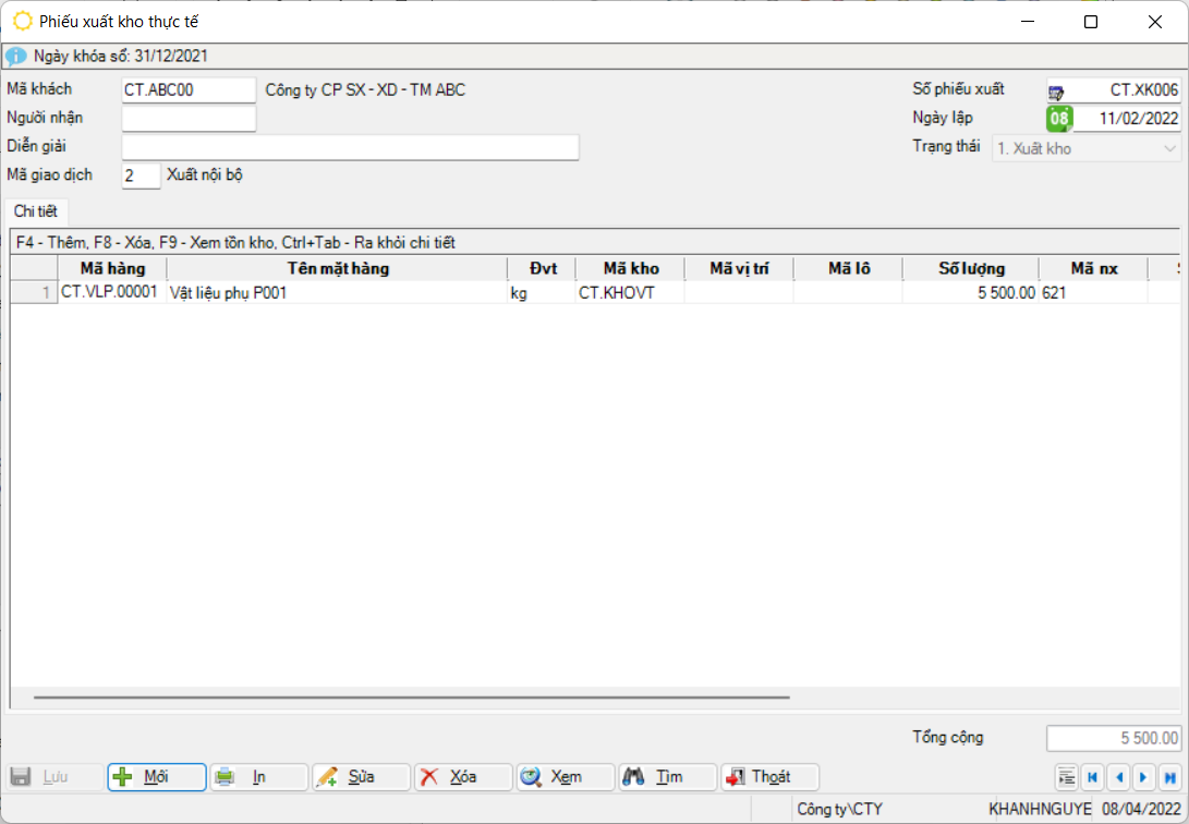 Mã khách Mã đối tượng nhập xuất vật tư. Thông thường mã khách hàng, nhà cung cấp được dùng để theo dõi công nợ, trong trường hợp phiếu xuất kho có liên quan tới các nghiệp vụ công nợ như cho mượn vật tư. Tuy nhiên, trong một số trường hợp không liên quan công nợ, thông tin này được dùng theo dõi các đối tượng nội bộ như dây chuyền, xưởng… Thông tin được chọn nhập từ danh mục khách hàng, nhà cung cấp. Người nhận Thông tin về người nhận vật tư. Thông tin người nhận vật tư được trả về từ trường “Đối tác” trong danh mục khách hàng, nhà cung cấp và có thể được nhập lại. Mã giao dịch Mã giao dịch dùng để phân biệt phạm vi sử dụng của phiếu xuất. Chọn mã giao dịch “Xuất nội bộ” và ”Xuất khác” nhằm mục đích phân loại, thống kê sau này. Về xử lý dữ liệu, các mã giao dịch có xử lý như nhau. Số phiếu xuất/ Ngày lập Thông tin về số chứng từ, ngày lập. Số chứng từ có thể do hệ thống tự tạo (định dạng số) hoặc do người sử dụng chủ động nhập vào. Mã hàng / Mã kho / Mã vị trí / Mã lô Nếu doanh nghiệp theo dõi tồn kho theo vị trí kho hoặc lô nhập thì phải nhập thêm thông tin về lô cần xuất và vị trí kho đã nhập vật tư trước đây. Sl kế toán Sau khi kế toán lấy số liệu từ phiếu xuất kho thực tế, chương trình sẽ tự động cập nhật lại số lượng tương đương tại trường sl kế toán. Qui tắc cập nhật lại phiếu xuất này như sau: