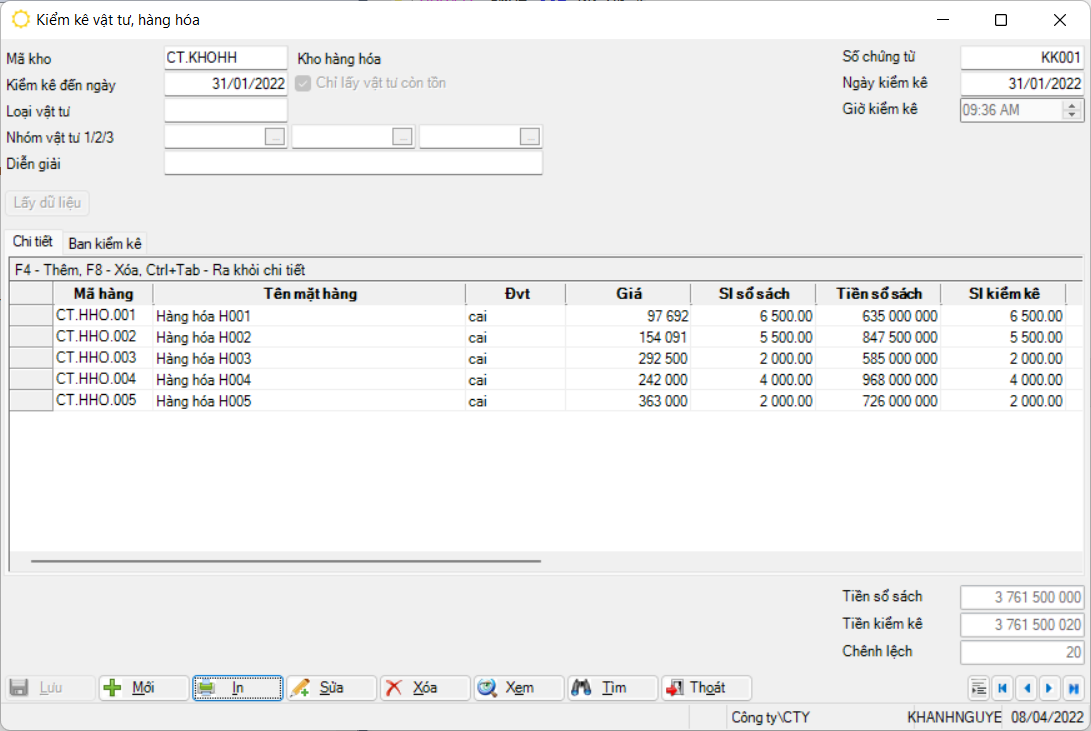 - Chỉ được thêm mới (F4) nếu đã tồn tại ít nhất 1 dòng có dữ liệu (vì nghiệp vụ thêm mới này chỉ dùng trong trường hợp nhập các vật tư không có tồn kho sổ sách nhưng vẫn có tồn kho thực tế khi kiểm kê);