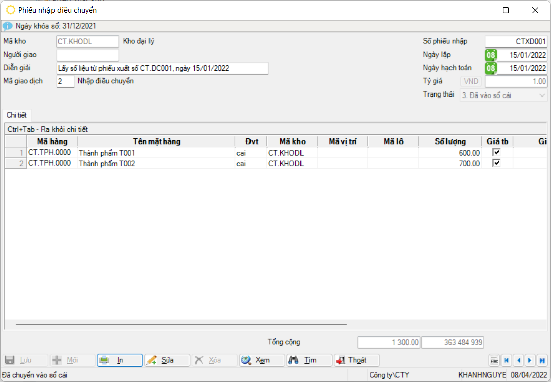 Nếu doanh nghiệp theo dõi tồn kho theo lô thì mã lô tự động chuyển từ phiếu xuất điều chuyển qua và không được sửa lại. Trong trường hợp kho nhận cũng theo dõi tồn kho theo vị trí kho thì vị trí kho nhận cũng được chuyển từ phiếu xuất điều chuyển qua nhưng trên phiếu nhập có thể xác định lại mã vị trí.