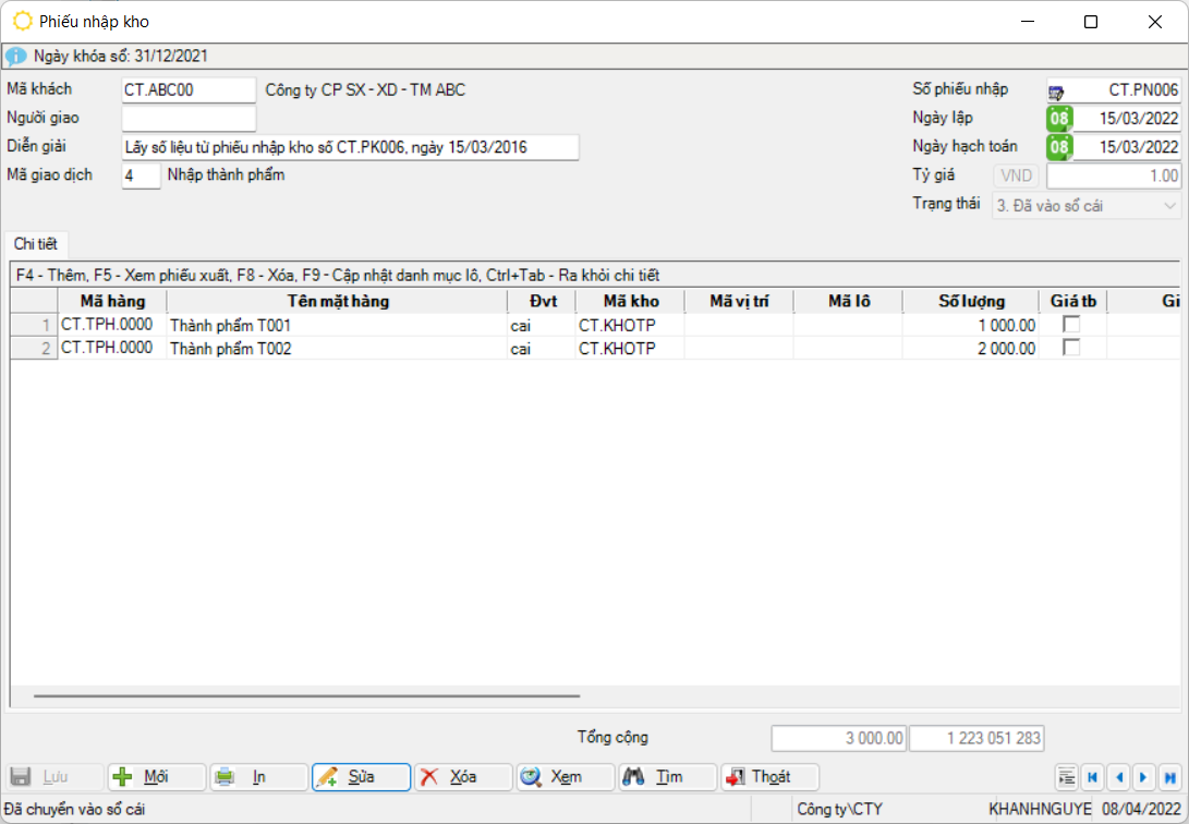 - Ngày nhập: ngầm định lần đầu khi thêm mới, lấy từ ngày lập chứng từ và cho phép sửa lại;