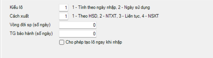 Khai báo về kiểu tính ngày hết hạn lô hàng. Có 2 tùy chọn cho kiểu xuất lô là “Tính theo ngày nhập” và “Ngày sử dụng”