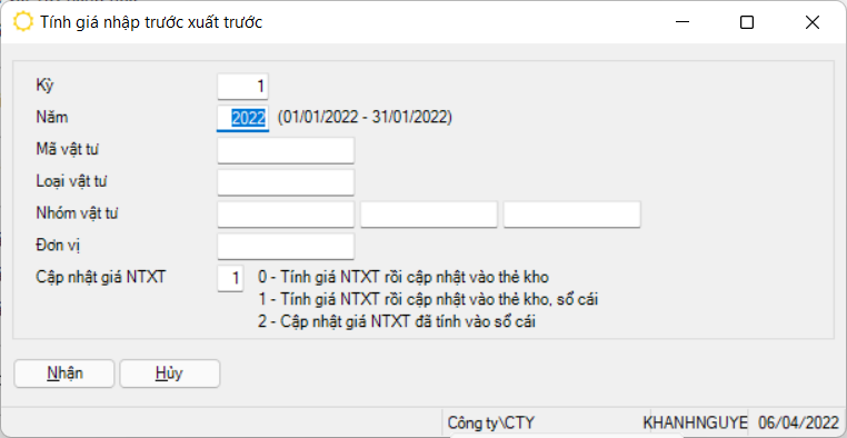 Việc khai báo các vật tư tính giá theo phương pháp nhập trước xuất trước được thực hiện ở phần khai báo các thông tin về vật tư. Chức năng tính giá NTXT được thực hiện ở menu “Tính giá nhập trước xuất trước”.