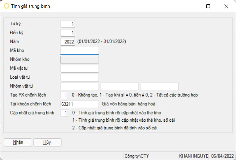 Lưu ý: trường hợp vật tư được tính theo giá chung cho các kho và khi tính giá trung bình có khai báo tại trường “Tạo PX chênh lệch”=2 – “Tất cả các trường hợp” thì tham số này phải được chọn là “Có” để số liệu tồn kho sau khi tạo chênh lệch vẫn đảm bảo tính hợp lý và cân đối.