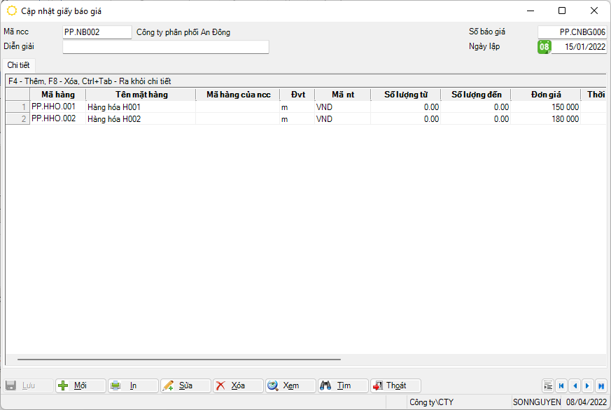 Ghi chú: khi rê chuột vào trường mã khách, cho phép hiện số dư tức thời và địa chỉ của khách hàng trên màn hình. Mã hàng/ Mã hàng của ncc Mã vật tư, hàng hóa/ Mã vật tư của ncc cần cập nhật giá. Đơn vị tính/ Mã ngoại tệ Đơn vị tính vật tư, hàng hóa và loại ngoại tệ báo giá Số lượng từ - đến/ Sl đặt tối thiểu/ Sl đặt tối đa Phạm vi số lượng áp dụng mức giá cập nhật, nếu người sử dụng không khai báo phạm vi này, mức giá cập nhật sẽ được áp dụng cho tất cả các số lượng đặt mua khác nhau của vật tư. Ngược lại, nếu có khai báo số lượng giới hạn cho một mức giá thì trong khi chọn nhà cung cấp sẽ không thể chọn mua theo giá này với một khoảng số lượng vượt ngoài giới hạn. Đơn giá Đơn giá báo của vật tư Thời gian thực hiện Thời gian mua hàng (từ khi đặt đến khi nhận hàng) của vật tư. Số báo giá/ Ngày báo giá Số báo giá và ngày báo giá của nhà cung cấp. Ngày bắt đầu hiệu lực/ Ngày kết thúc hiệu lực Ngày bắt đầu hiệu lực và ngày kết thúc hiệu lực của giá báo. Để chọn ncc, yêu cầu ngày của hệ thống phải nằm trong khoảng này.