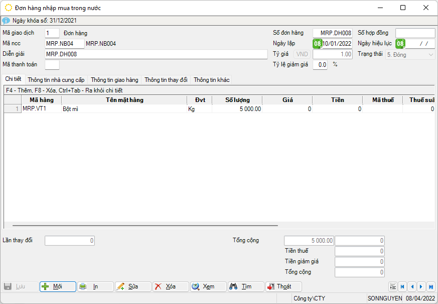 Mã hàng Mã vật tư đặt hàng, lấy từ Danh mục vật tư (bắt buộc khai báo) Đvt Đơn vị tính của vật tư hàng hóa, có thể được lấy mặc nhiên như trong danh mục vật tư nhưng cũng có thể thay đổi qua đơn vị tính quy đổi trong những trường hợp đặc biệt. Số lượng Số lượng vật tư đặt hàng (bắt buộc khai báo) Giá (USD) Đơn giá mua của vật tư theo đồng ngoại tệ khai báo, trường này chỉ hiện lên nếu trong phần thông tin chung chọn trường tiền là ngoại tệ, không phải VND Tiền (USD) Số tiền phát sinh theo đồng tiền ngoại tệ Mã thuế Mã thuế GTGT của vật tư, lấy từ Danh mục thuế Thuế suấtThuế suất GTGT của vật tư Thuế (USD) Tiền thuế GTGT của vật tư theo đồng ngoại tệ khai báo, trường này chỉ hiện lên nếu trong phần thông tin chung chọn trường tiền là ngoại tệ, không phải VND Ngày giao Ngày giao hàng Giá Đơn giá mua của vật tư theo VND, trường này sẽ thay vị trí trường Giá (USD) nếu phần thông tin chung chọn trường tiền là VND Tiền Số tiền phát sinh theo đồng tiền hạch toán Thuế Tiền thuế GTGT của vật tư theo VND, trường này sẽ thay vị trí trường Thuế (USD) nếu phần thông tin chung chọn trường tiền là VND Sl nhập Số lượng vật tư đã nhập kho Sl hoá đơn Số lượng vật tư đã cập nhật hoá đơn Vụ việc Vụ việc, dự án, công trình… liên quan đến yêu cầu về vật tư