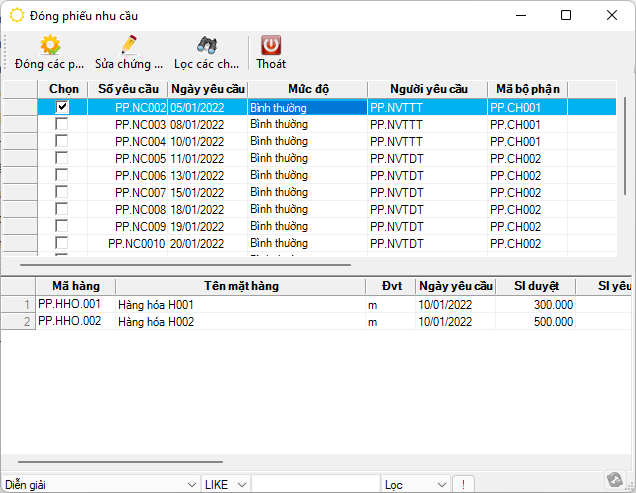 Màn hình đóng phiếu nhu cầu vật tư