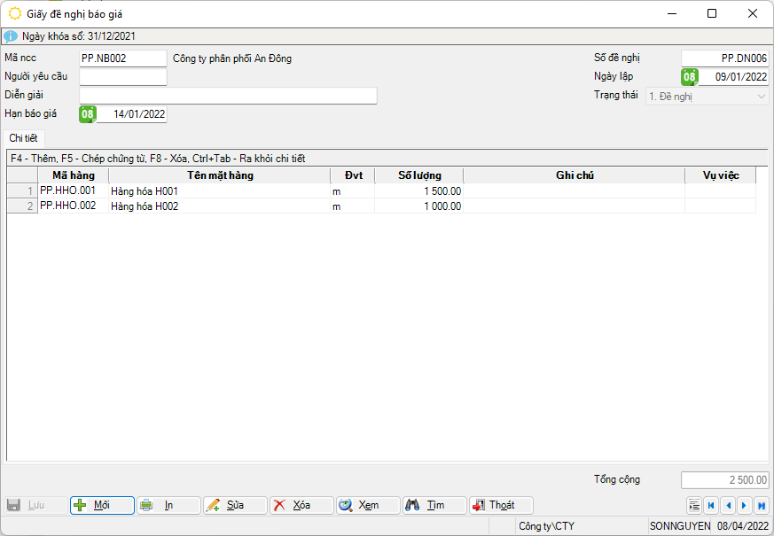 Ghi chú: khi rê chuột vào trường mã khách, cho phép hiện số dư tức thời và địa chỉ của khách hàng trên màn hình. Người yêu cầu Người yêu cầu báo giá vật tư, có thể là người lập đề nghị báo giá. Diễn giải Giải thích lý do, mục đích… hỏi giá vật tư. Hạn báo giá Thời gian yêu cầu nhà cung cấp báo giá. Số đề nghị Số giấy đề nghị báo giá, người sử dụng có thể tự gõ hoặc chương trình tự đánh số tuỳ theo khai báo trong hệ thống danh mục chứng từ. Ngày lập Ngày lập giấy đề nghị báo giá. Trạng thái Trạng thái của giấy đề nghị báo giá (chương trình tự xử lý). Giấy đề nghị báo giá có 02 trạng thái: “Lập chứng từ” và “Đề nghị” Xử lý Tùy chọn xử lý giấy đề nghị báo giá . Giấy đề nghị báo giá có 2 tùy chọn xử lý: “Lập chứng từ” và “Đề nghị”. ứng với mỗi tùy chọn xử lý của người sử dụng, trạng thái của giấy đề nghị báo giá sẽ thay đổi tương ứng.