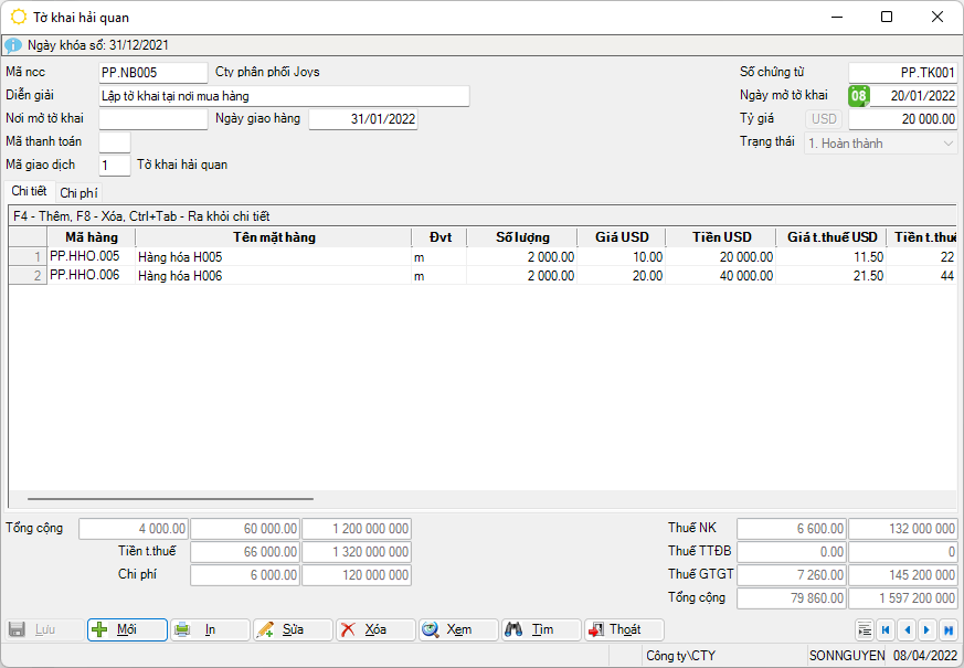 - Ngăn 2 – Chi phí: cập nhật các chi phí phát sinh ở nước ngoài liên quan đến quá trình nhập khẩu hàng hoá (nếu có).