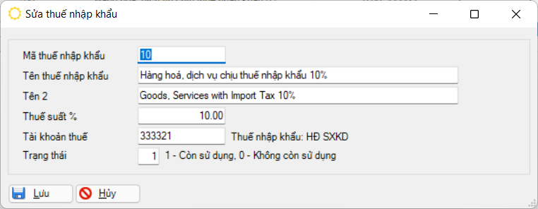 Mã thuế nhập khẩu Mã thuế nhập khẩu, gõ tự do, tối đa 8 ký tự. Tên thuế nhập khẩu Mô tả nội dung thuế, gõ tự do, tối đa 128 ký tự. Tên 2 Tên mô tả bằng tiếng Anh của mã thuế. Thuế suất % Thuế suất thuế nhập khẩu Tài khoản thuế Tài khoản hạch toán của mã thuế này, lấy từ Hệ thống tài khoản. Tài khoản thuế được hạch toán tự động trong phiếu nhập hàng nhập khẩu. Trạng thái Trạng thái sử dụng của mã thuế này, chọn 01 trong 02 trạng thái: 1 – Còn sử dụng, 0 – Không còn sử dụng.