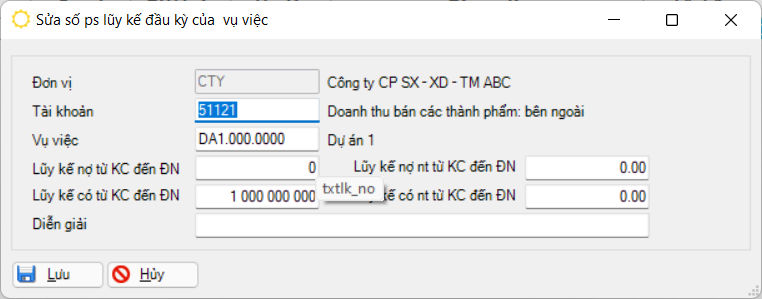 Ngoài việc cập nhật số dư đầu kỳ cho các hạng mục vụ việc, phải nhập số lũy kế từ khi khởi công. Người sử dụng chỉ phải cập nhật số lũy kế từ khi khởi công 1 lần duy nhất khi bắt đầu sử dụng chương trình.