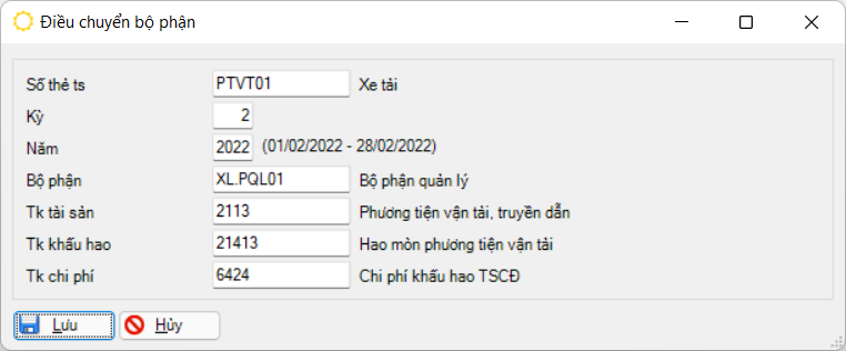 Chi phí khấu hao kể từ kỳ điều chuyển sẽ được phân bổ cho tài khoản khấu hao, tài khoản chi phí và bộ phận mới được khai báo ở màn hình này.