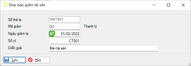 Lưu ý: Nếu trong “Khai báo tham số tùy chọn” không chọn chức năng tính khấu hao theo ngày, thì chương trình vẫn tính khấu hao tài sản trong tháng khai báo giảm, để không tính khấu hao trong tháng phải khai báo vào ngày cuối tháng (trước tháng giảm), ngược lại chương trình chỉ tính khấu hao những ngày tài sản đã sử dụng (tính đến ngày giảm tài sản trong tháng).