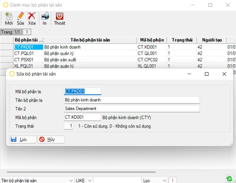 Danh mục bộ phận sử dụng tài sản dùng để khai báo các bộ phận, phòng ban sử dụng tài sản.