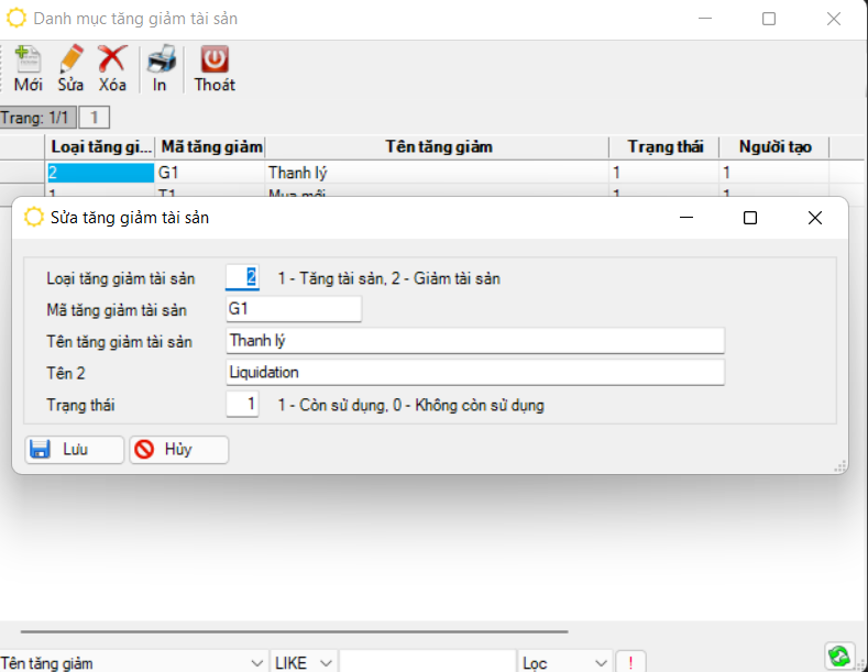 Danh mục lý do tăng giảm tài sản dùng để khai báo lý do tăng giảm tài sản, dùng trong danh mục tài sản và các báo cáo về tăng giảm tài sản.