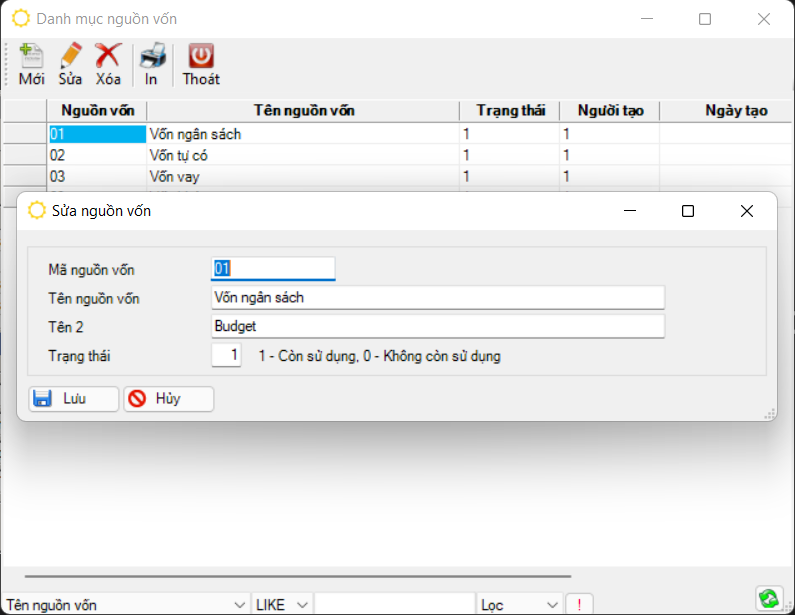 Đường dẫn: Tài sản cố định → Danh mục nguồn vốn
